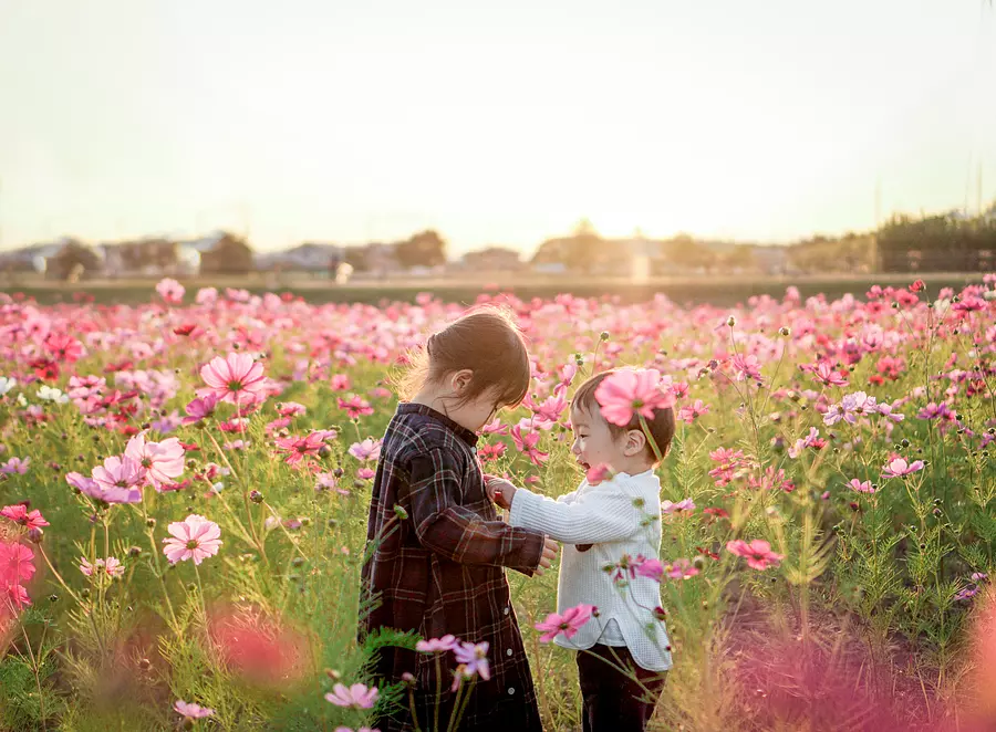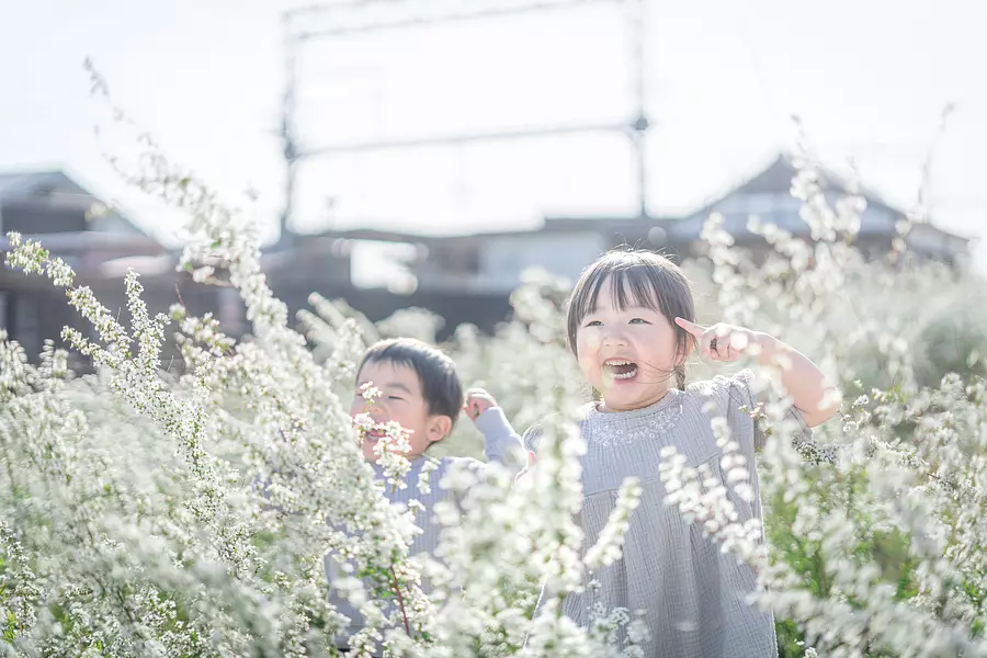 ユキヤナギは花丈が1~2メートルと低いため、子どもが木の下に座るだけで雪のように降り注ぐ花に埋もれているような幻想的な一枚になります。