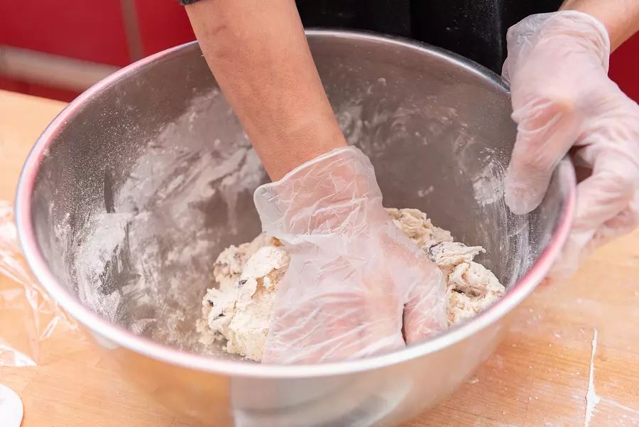 ボウルの中である程度生地がまとまったら、作業台に取り出し、ぐっと力を入れてこねていきます。何種類もの生地を人の手でこねる、とても体力のいる作業です。