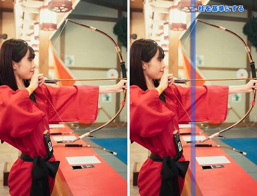 コツは真ん中にある垂直のものを基準にすることです。右側の柱を垂直にすると、写真全体が傾くので気をつけてくださいね。