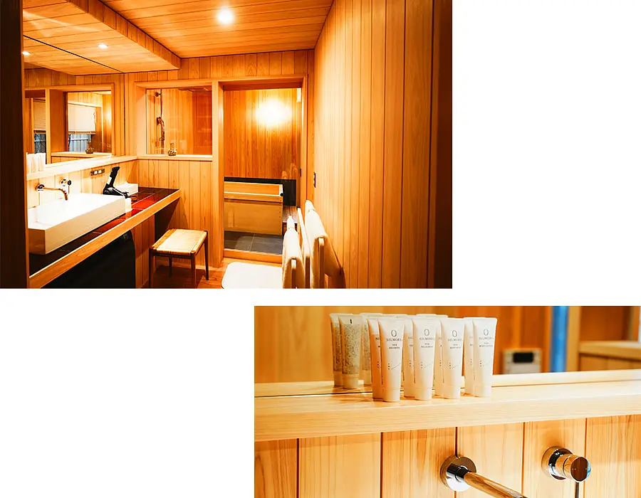 なんとお風呂は庭園を望むことができる半露天の檜風呂になっていました。外の空気に触れながら気兼ねなく贅沢なバスタイムを過ごせそうですね。このお風呂素敵すぎます。