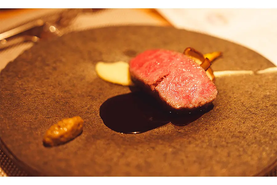 - 伊賀牛ロース肉のグリエ酒粕の香るジャガイモのピューレ(オプションExstra+1,000円/1名分★〆の出し茶漬け