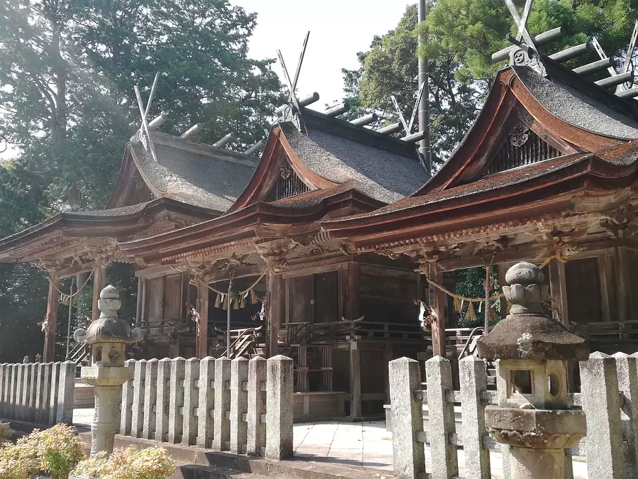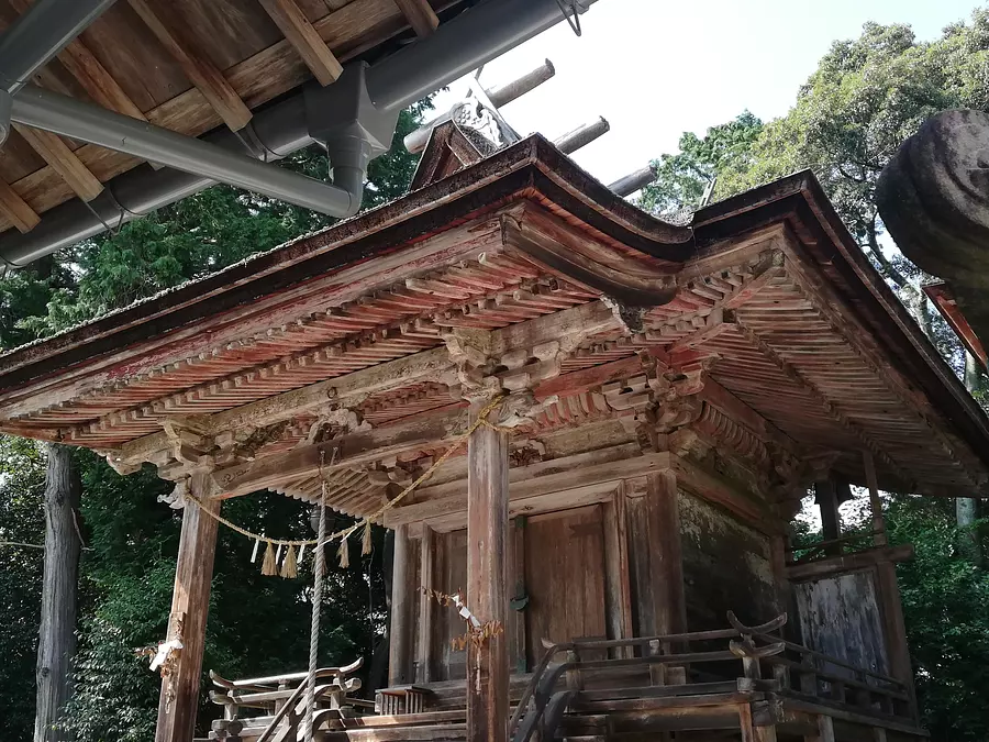 津市白山町南出、いわゆる倭(やまと)地区にある、白山比咩神社(しらやまひめじんじゃ)のうちの一つ。 春日造(かすがづくり)の社殿が3つ並んでいる姿は魅力的です。 左から本殿、八幡社・須賀社、祖霊社(それいしゃ)で、中央の八幡社・須賀社、向かって右側の祖霊社は、400年以上の歴史を持つ建物です。