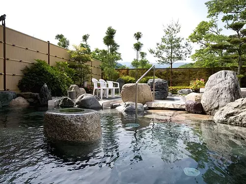 近くの青山高原に林立するの風車を眺められる露天風呂が人気です。