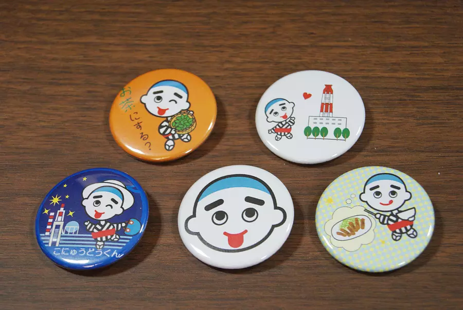四日市市のゆるキャラ「こにゅうどうくん」の缶バッチは、ここでしか買えないレアグッズ。1回100円のガチャガチャで、お目当てのものが出てきたら、テンションUP!