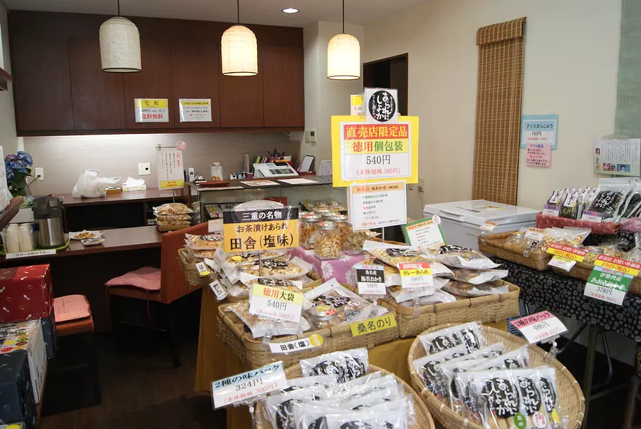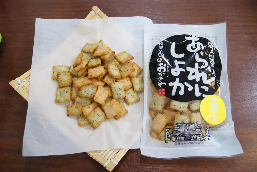 写真の「みえ川越町産 あられにしよか」マヨネーズ味は、人気NO.1商品。それぞれ厳選した海老、あおさ、ごまを贅沢に使用していて、一度食べると止まらなくなります!