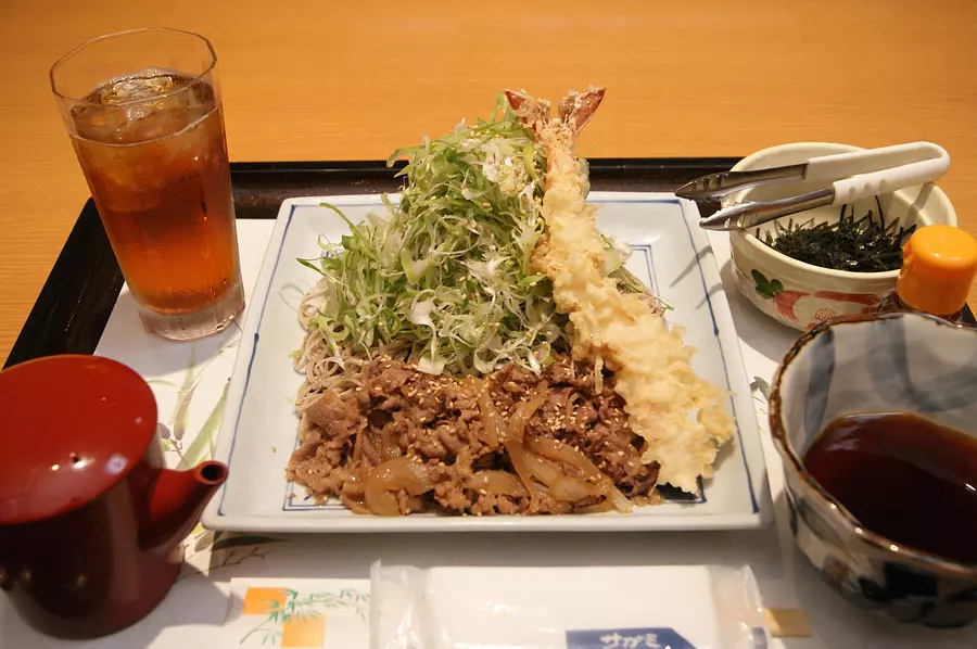 注文したのは、お店のイチオシメニュー「大海老天肉ねぎそば」(1,340円+税)。ボリューム満点で、見た目のインパクト大!「サガミ」の麺は、厳選した「そばの実」をそのままの状態で各店舗へと配送し、店頭の石臼で細かく挽き、1日2回製麺しているため、そば本来の風味を楽しめるんです。