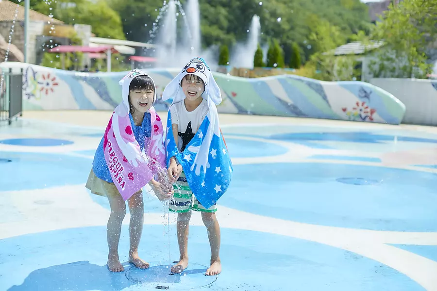 コロンブス広場にある「チャプチャプラグーン」は噴水が吹き上がったり、水が飛び出す仕掛けの樽があったり、子どもたちが楽しく水遊びできるフリースペース。