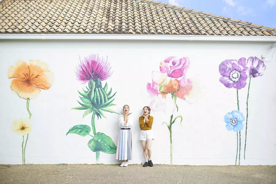 こちらはカルメン通りのウォールアート。白壁に鮮やかなお花の絵が描かれています。