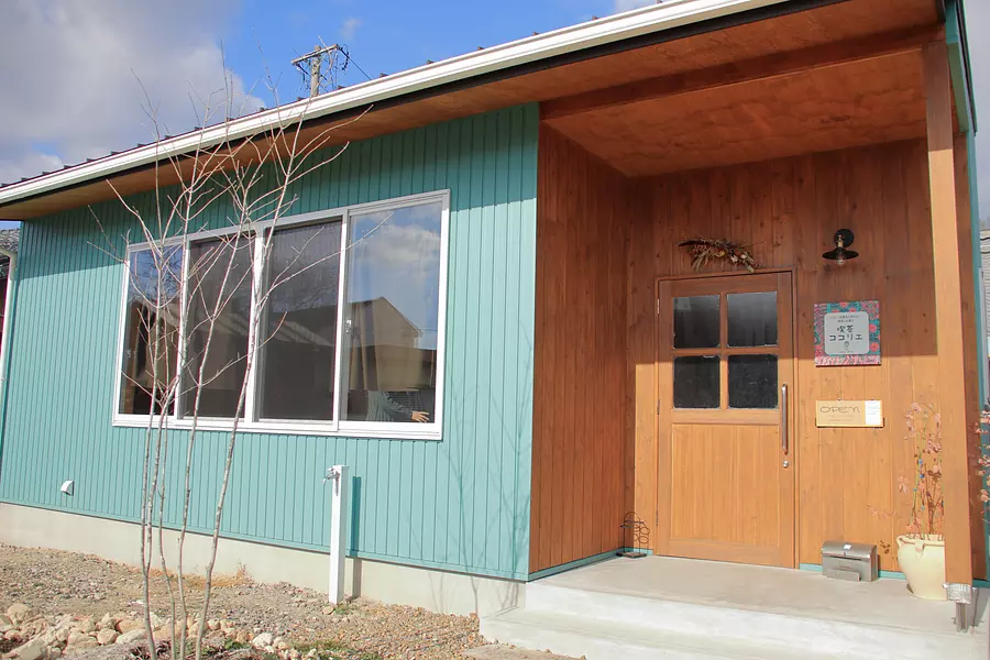 温かみのある優しいブルーグリーンの外観が可愛らしい「喫茶ココリエ」。もともと2012年より小さな工房でお菓子を作り、注文販売やマルシェでの販売を行っていました。2019年5月、かねてより夢だったカフェをオープン。