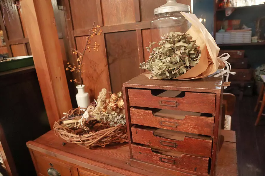 店内の装飾はすべて店主のアイデア。どの一角も、まるでどこかで見たドラマのワンシーンのようです。古道具や雑貨と一緒に飾られたドライフラワーは、すべて店主の手作り。古道具や雑貨よりもたくさん売れる、密かな人気商品です。