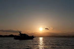夕日に照らされて移りゆく中を優雅にクルージング。