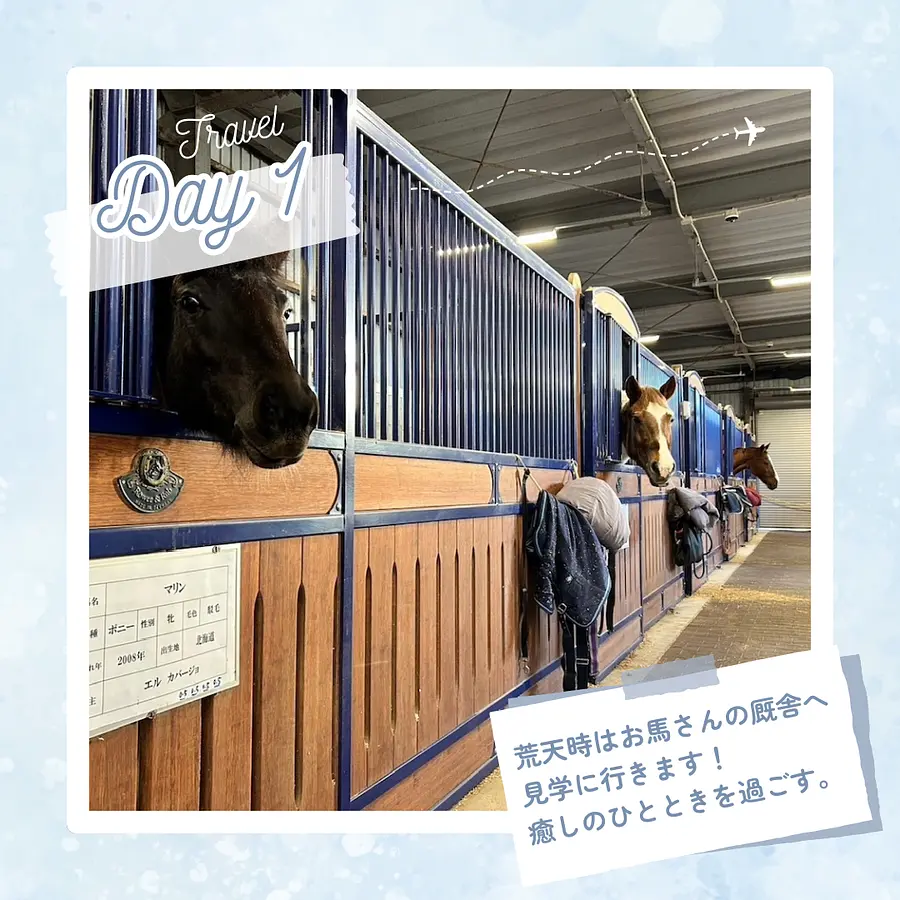 荒天の場合は、乗馬クラブの厩舎見学に変更になりますので、安心してご参加いただけます。