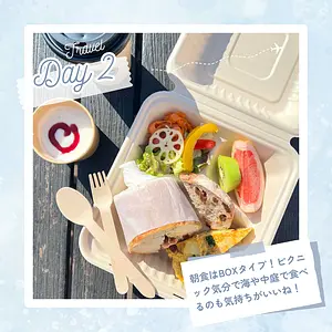 朝食はBOXタイプで、ご用意します。海辺やお部屋などお好きな時間、お好きな場所でお楽しみいただけます。