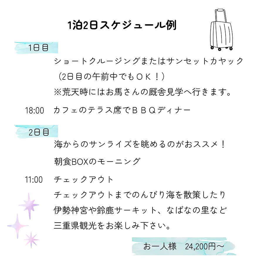 1日目の午後または2日目の午前に、カヤック体験やショートクルージングをお楽しみいただけます。