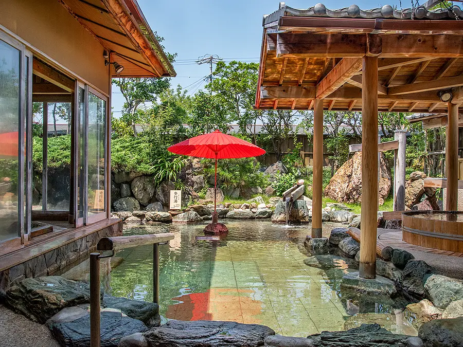 湧出量1200ℓ/分豊富な自家源泉をお楽しみいただけるのは、露天風呂のバラエティ豊かなお風呂が楽しい、庭園露天風呂「風待ちの湯」。内湯をはじめ、檜風呂、岩風呂、打たせ湯、歩行湯、寝湯と、趣の異なるお風呂をご用意。館内最上階にある展望風呂は、的矢湾を一望できる開放感が自慢です。