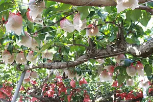 津市高茶屋の静かな住宅街のオアシス的な存在で、身近に自然を楽しめる農園。有機質肥料と減農薬にこだわった甘みいっぱいの幸水、豊水、新高、あきづき、新興などが味わえる。梨狩りと巨峰ぶどう狩りの両方を楽しむことができるセット狩りが大好評。