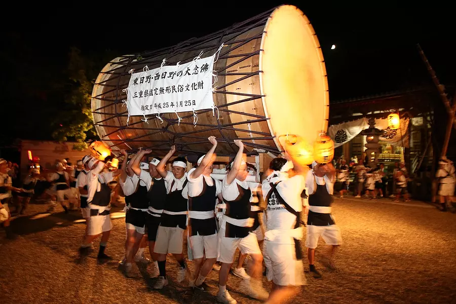 直径2m以上の太鼓と重さ300kgもある鉦を打ち鳴らし、13日に西覚寺から顕正寺に参詣し、15日には日野神社から西覚寺に参詣し、五穀豊穣と魔障禁圧を祈願します。