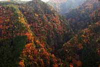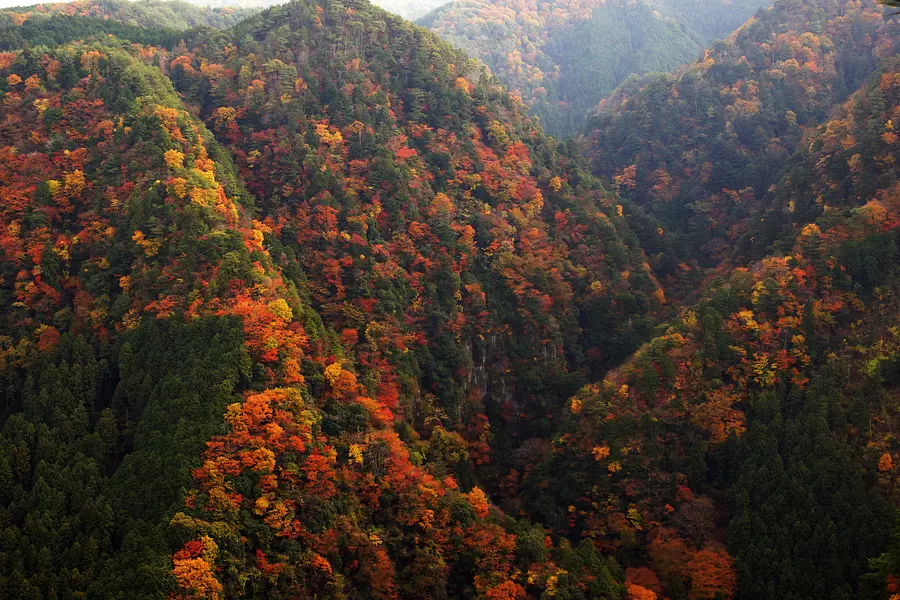 長坂山へのトレッキングコースからは紅葉で色づく渓谷と山並みを一望できます。