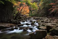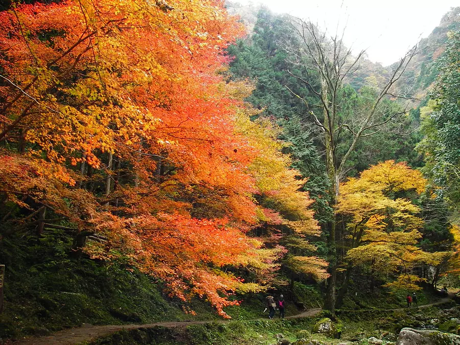滝川上流を約4kmに渡る渓谷は、四季を通じて見事な自然景観を誇り、片道1時間半の遊歩道はハイキングコースとしても人気があります。赤目四十八滝の秋は、イロハモミジ、カエデ、ヤマザクラなどが渓谷を赤く染め、さらに格別。