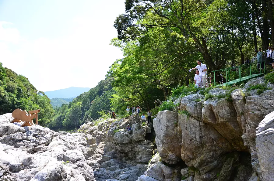 大滝峡内の水戸神神社で行われる神事で、川の中程の大岩のくぼみに鮎を投げ入れ、今年の運勢の吉凶を占います。