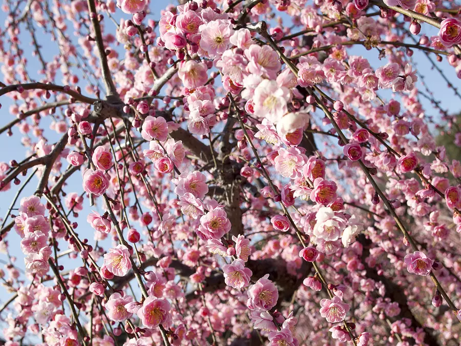 国分の天神さんと親しまれる菅原神社には、氏子や参拝者により寄贈された約350本の枝垂れ梅が境内に咲き誇ります。白から薄いピンク、濃い桃色までさまざまな景色が楽しめます。