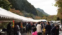 白藤滝周辺に模擬店が立ち並び、秋に彩られた滝や味覚を満喫できます。