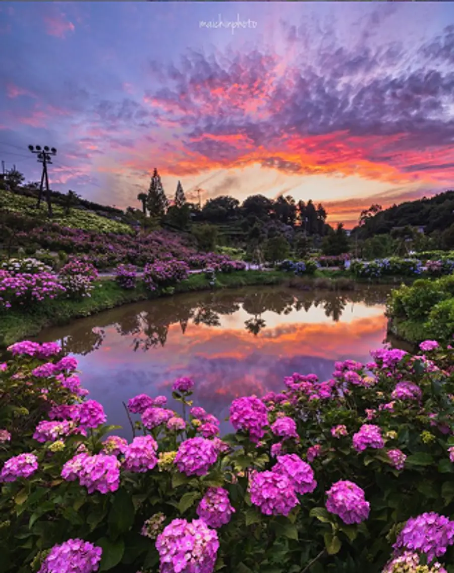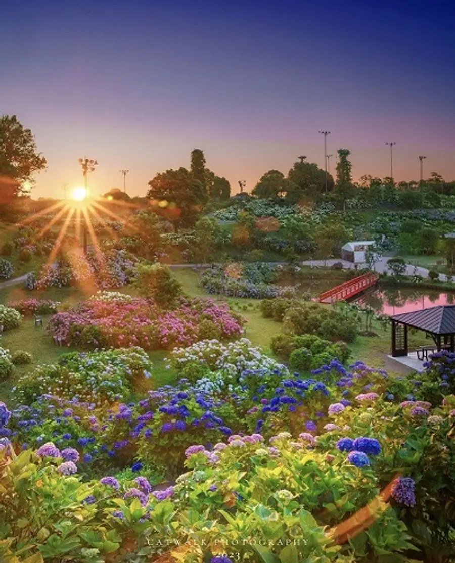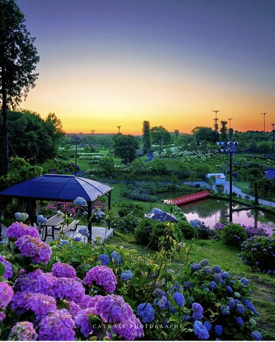 5月下旬ごろから「額花」が色づき始め、6月中旬ごろには全品種が最も美しい「美頃」となり、その後「真花」が咲き、やがて額花が「シャビーシック(味わいのあるアンティーク調の美しさ)」へと変化していきます。かざはやの里では、あじさいの見頃を「色づき始め」→「美頃」→「シャビーシック」と表現し、色と表情の移ろいをお楽しみいただけます。予約制の日の出撮影や、夕焼け撮影も可能です。一番の美頃は例年6月10日〜20日ごろです。