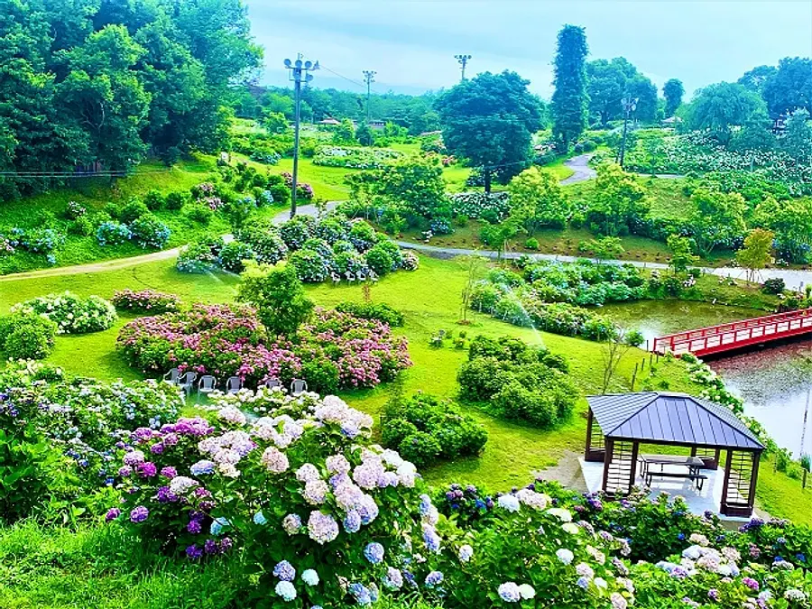紫陽花エリアでは、53品種・77,700株のあじさいを、33,000㎡の広大な丘陵地に「恋のWAVE」「TSUWAVE」「あじさい花時計」「品種別あじさい花壇」「風早池の借景」など、地形を活かしたデザインで植栽しました。あじさいエリアの約半分を一望できる場所からは、思わず歓声が上がるほどの絶景が広がり、「あじさいでつくる別世界」として「日本一綺麗なあじさい園」と評されています。