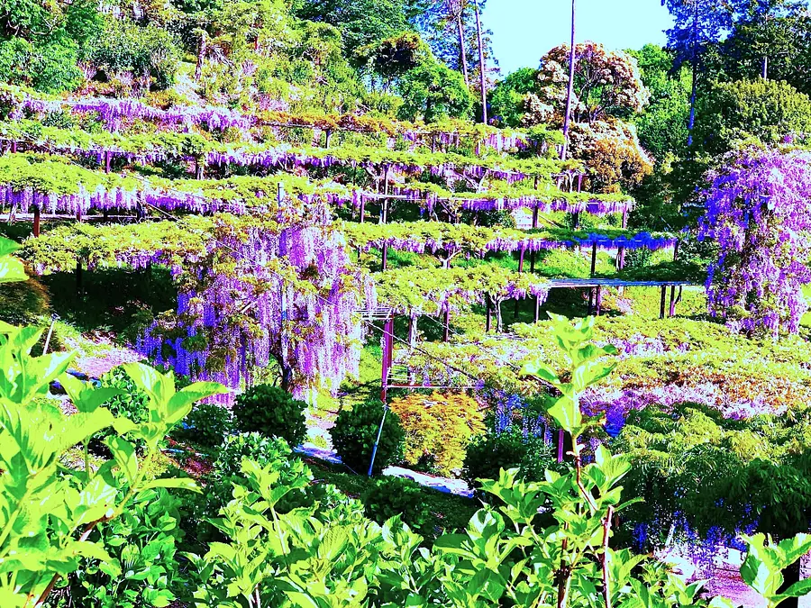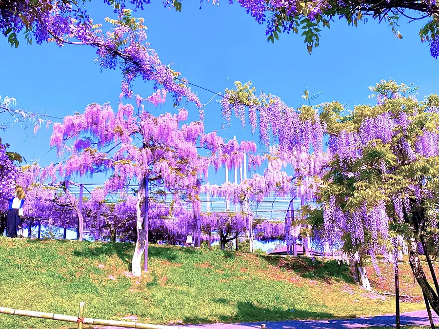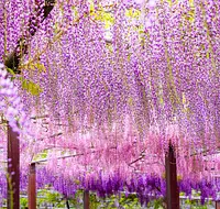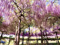 We have 10 types of Wisteria which are named Shirokapitan, Murasakikapitan, Benifuji, Kuchibenifuji, Rokusyakufuji, Kyusyakufuji, Nagasakiissaifuji, Yaekokuryufuji, Ko-kuryufuji and Shironodafuji. These bloom on 10 different types of wisteria trees in an 10 thousand square meter area from the end of April to early May.