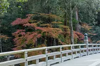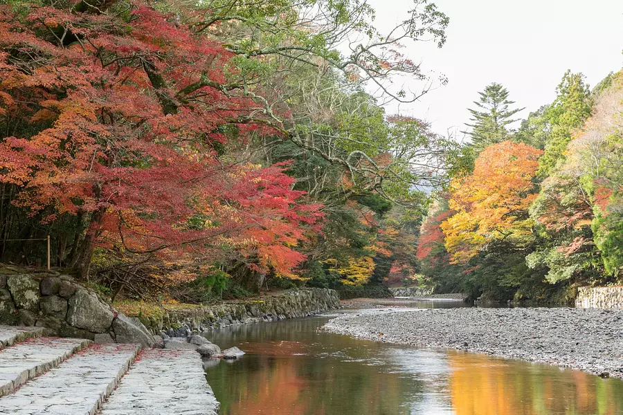 内宮御手洗場では五十鈴川の清らかな流れが、鏡面のように赤や黄に色づいた木々を映し出し、秋の深まりを感じさせます。また風日祈宮橋から眺める紅葉も美しいです。