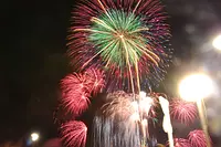 鳥羽湾の空と海を彩る海上の花火大会。花火や遊覧船の光が水面に反射して幻想的な景色が楽しめます。