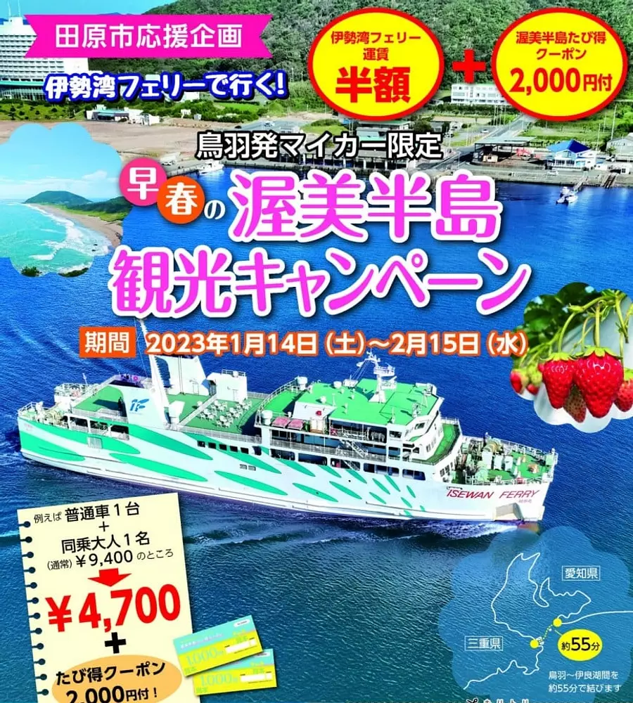 伊勢湾フェリー運賃が半額!さらに田原市内96施設で利用できる『渥美半島たび得クーポン券』がマイカー1台につき2,000円貰える超お得なキャンペーン!