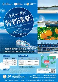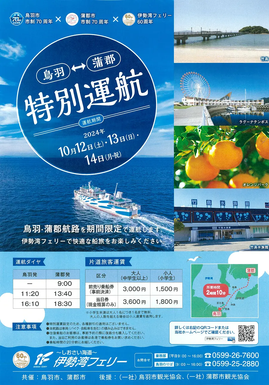 鳥羽市市政70周年×蒲郡市市政70周年×伊勢湾フェリー60周年を記念して、かつて鳥羽から発着していた鳥羽蒲郡航路を3日間限定で特別運航いたします。