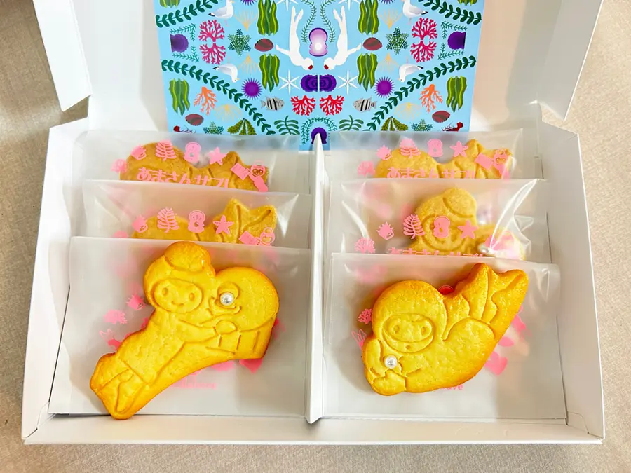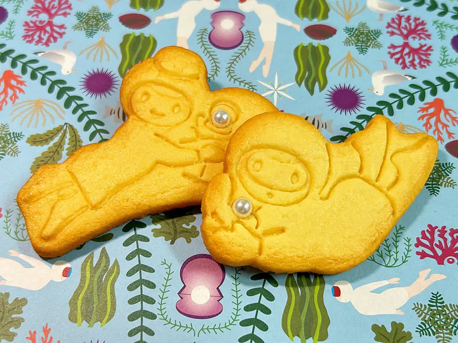 伊勢志摩の海女を愛らしくかたどったサブレ。三重県産の小麦粉と新鮮な卵に、たっぷりのバターとアーモンド粉末を加え、さらにカシューナッツと塩で風味を引き立たせ、一枚一枚丁寧に焼き上げられています。