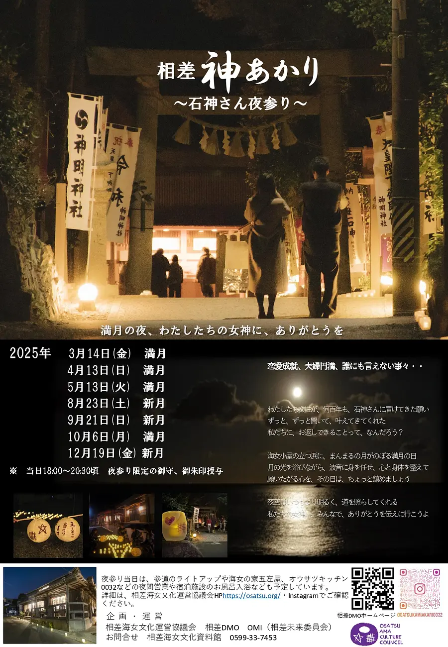 現役の海女さんが一番多く暮らすまち相差で海女さんが大漁、安全を祈願する石神さん。女性の願いをひとつ叶えてくれる石神さんへお月さまのパワーをもらいながらお参りしてみませんか。