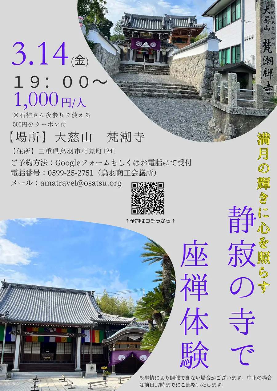 3月14日(金)19時~梵潮時で座禅体験を行います。