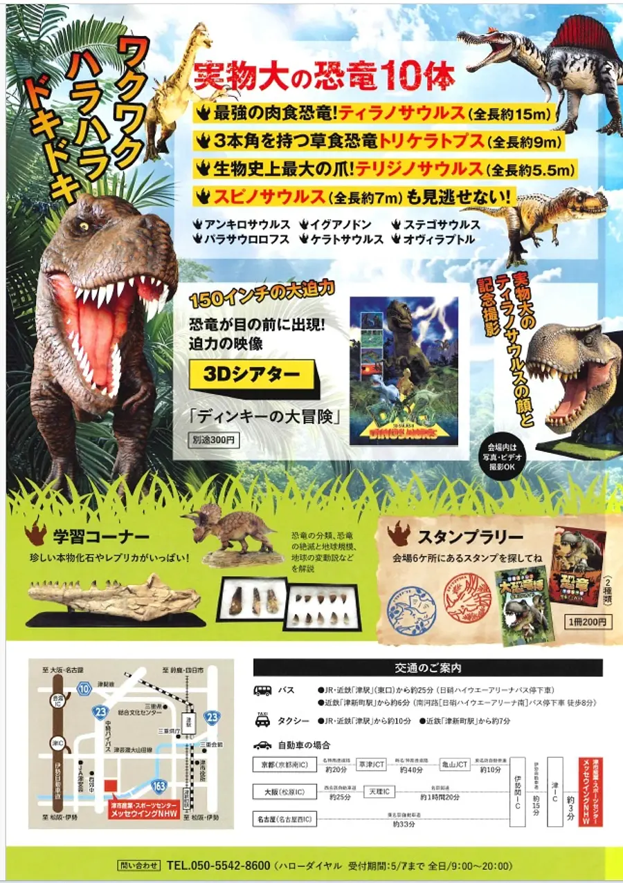 実物大の恐竜10体!ティラノサウルス、トリケラトプス、テリジノサウルスなどの恐竜が!
