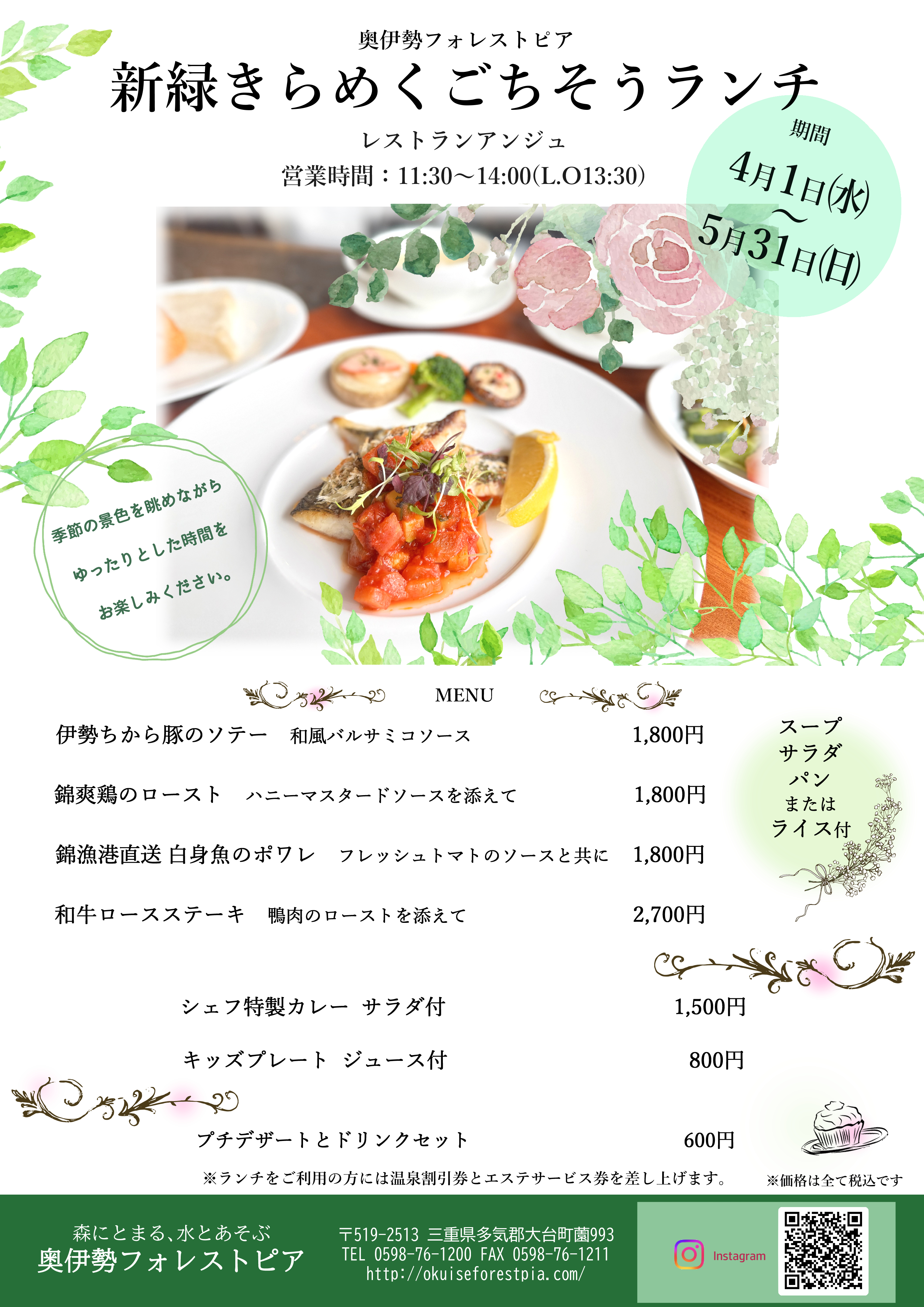 レストラン「アンジュ」より、2026年4月・5月 のランチのお知らせです。