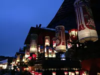 本日/小屋台、神輿が一日中町内を練り歩き、軒に吊るした祭り提灯に火が灯り、高張提灯が神輿の上に掛かる頃、祭りは最高潮を迎えます。神輿は神社に納められ祇園まつりは静かに終わります。