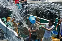 ご神体を乗せた船(まんど船)に地元の漁船も同航し、漁業関係者が大島に渡ります。大島では地元で獲れた魚介類を漁師や海女が神前に供え、海上安全と豊漁を祈願する神事がとり行われます。その後、全ての船が和具漁港に戻ると船上からお互いの船に向けて一斉に潮かけが始まり、祭りはクライマックス。