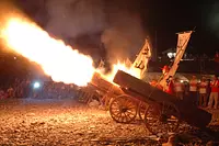 花火や瀞流太鼓、迫力ある北山砲(きたやまづつ)など毎年いろいろなイベントが行なわれます。祭りのメインとなる「柱まつり」は、ひもの付いた松明を回転させながら、約20mの高さのある杉柱に取り付けられた竹籠めがけて投げ入れます。あらゆる災害をたいまつとともに夜空に放つことで、筏流しの筏師たちの安全祈願や無病息災、大漁を願って遠い昔から熊野川水系で行なわれてきました。