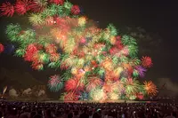 吉野熊野国立公園の鬼ヶ城を背景に、大海原に向って豪快な花火絵巻をくりひろげるもので、熊野路最大の夏の風物詩となっています。約10,000発の花火が世界遺産を美しく染めます。