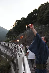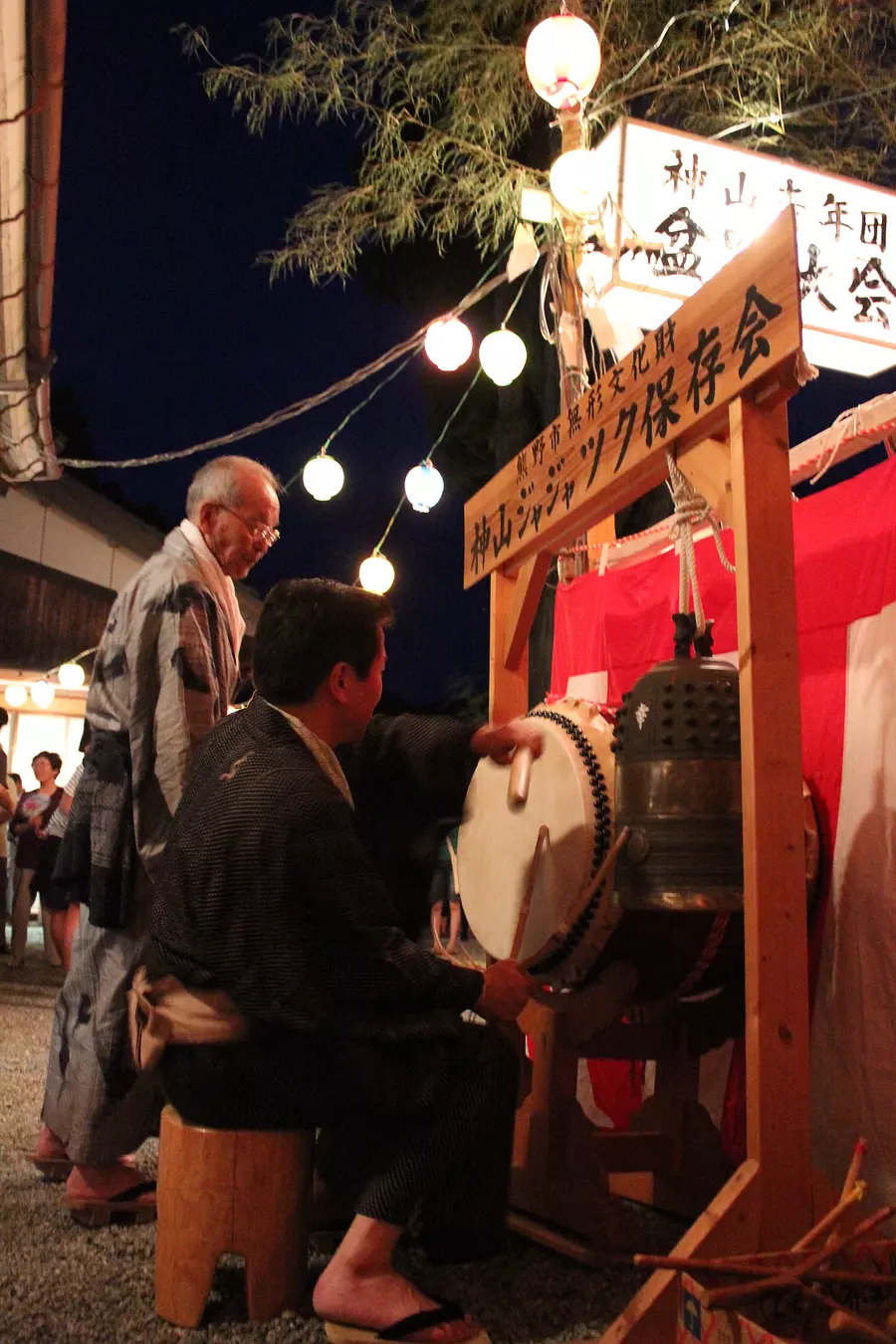 初精霊を送り迎えする灯火を掲げ、『ジャジャツク』と呼ばれる楽器を用いて盆踊りの始まりを告げてから、初精霊供養を行う伝統行事で無形民俗文化財(市指定)に指定されています。