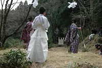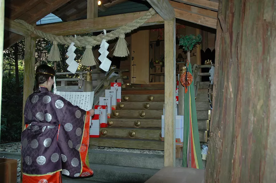 一年の平安を祈願して「弓引き神事」が行われます。水垢離によって禊をした後、弓引き役は白装束に着替えます。当屋の組から選ばれた2人の弓引きが6回ずつ合計12本の矢を放ちます。的までの距離は約12m、的の大きさは約90cm。杉の巨木が立ち並ぶ厳粛な雰囲気の中行われる。