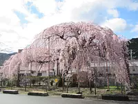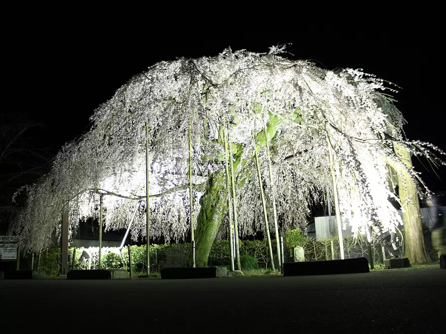 樹齢150年とも言われる枝垂れ桜。開花から夜間ライトアップします。