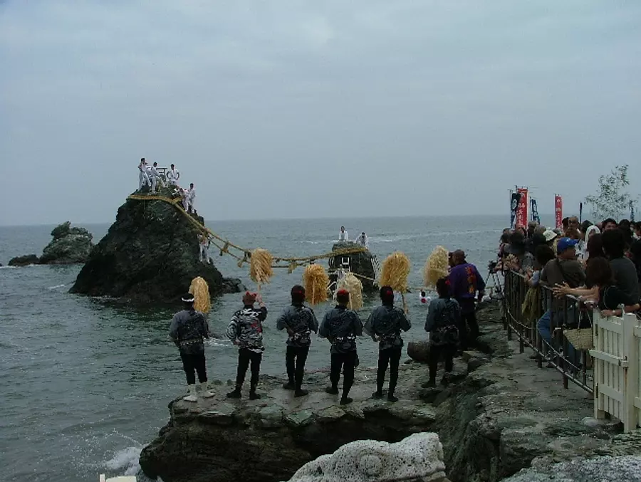 【二見興玉神社】夫婦岩 大注連縄張神事<参拝者による手送り・餅まき中止> メオトイワ オオシメナワハリカエシンジ