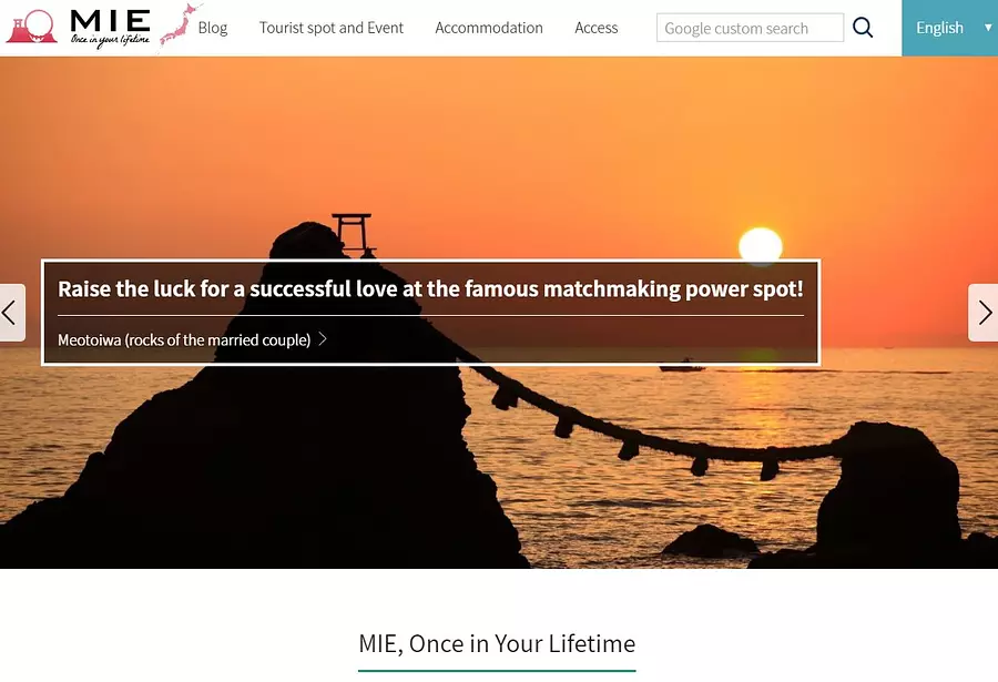 公益社団法人三重県観光連盟(津市羽所町700 アスト津2F、会長 雲井 敬)は、三重県の観光情報を魅力的に英語で発信するサイト「MIE, Once in Your Lifetime」を平成30年10月15日に公開しました。