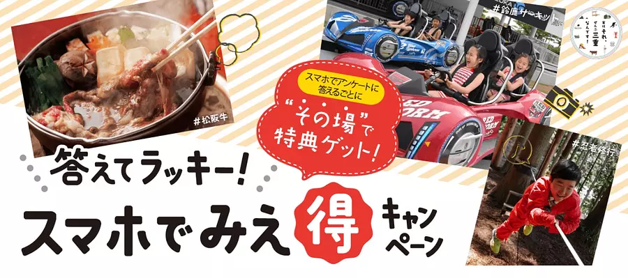「みえ旅案内所」や「みえ旅おもてなし施設」に設置してある表示ステッカーやPOPに記載のQRコードを読み込んでアンケートに答えると、プレゼントや割引など、その施設ならではのおもてなしと、1ポイントをゲット!