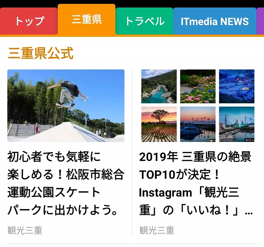 スマートニュースに開設されている「三重県チャンネル」内に設置された「三重県公式」の枠内に公式サイト「観光三重」の観光情報が表示されます。なお「トラベルチャンネル」に掲載される可能性もあります。
