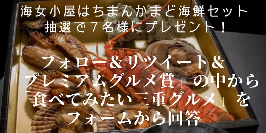今なら、キャンペーン公式サイト(https://bit.ly/3ea3vzN)をチェックして、「プレミアムグルメ賞」の中から『食べてみたい三重グルメ』を回答&Twitterフォロー&リツイートするだけで、抽選で7名様に「海女小屋はちまんかまど海鮮セット」をプレゼントします!